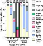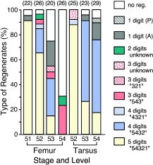 Figure 2. Digit pattern of regenerates from limb buds amputated at various stages. The limb buds were amputated at the presumptive femur or tarsus level. The digit pattern was examined after metamorphosis by observing the skeletal preparations. The total number of each operation is shown in parentheses. P, posterior type digit; A, anterior type digit. |