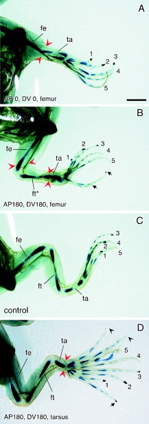 Figure 5. AâD: Transplantation of blastema to the stage 52 stump. Blastema was induced by the amputation of the stage 52 limb bud at the presumptive tarsus level. Five days after amputation, blastema was grafted to the stage 52 stump amputated at the presumptive femur (A,B) or tarsus (D) level with (B,D) or without (A) 180-degree rotation. The control right limb (C) and operated left limb (B) are the same animal. The transplantation procedure is shown in Figure 1E. A, B, and D correspond to E1, E2, and E3 in Figure 1E, respectively. The red arrowheads indicate the amputation plane. The black arrowheads and arrows represent each set of supernumerary digits. Asterisks indicate the regenerated fibula and tibia. fe, femur; ft, fibula and tibia; ta, tarsus; â12345,â digits; AP, anteroposterior; DV, dorsoventral. Scale bar = 2 mm in A (applies to AâD). |