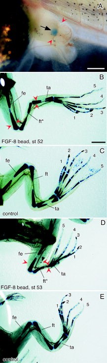 Figure 6. Fibroblast growth factor-8 (FGF-8) -induced intercalary regeneration. The limb buds at stage (st) 52 (AâC) or stage 53 (D,E) were amputated at the presumptive tarsus level and transplanted to the stump that was amputated at the presumptive femur level (same operation as in Fig. 1D, D1). The bead soaked in FGF-8 was held with tungsten wire pins between the limb bud tip and the stump. A: The pins were removed two days after the operation. B,D: The left limb regenerated with FGF-8 bead. C,E: Control right limb (without operation). The manipulated and control limbs belong to the same frog. The red arrowheads indicate amputation plane. The black arrows in A,D point to a bead. D: The implanted bead was sometimes observed in the skeletal preparation and always found at the amputation plane of the femur level. Asterisks indicate the intercalated skeletons. fe, femur; ft, fibula and tibia; ta, tarsus; â12345,â digits. Scale bars = 400 μm in A, 2 mm in B (applies to BâE). |