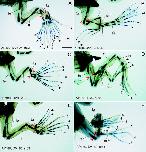 Figure 1. Schematic drawings of the experimental procedures. A: Fate maps adapted from Tschumi (1957). The zone of polarizing activities (Cameron and Fallon, 1977) are combined with the maps. The high and low polarizing activities represent the percentages of digit duplications after a 180-degree rotation (anteroposterior [AP] and dorsoventral [DV] axes were opposed) more than 40% and 20%, respectively. The photograph shows the skeletal preparation of a normal limb at stage 60. The arrowheads indicate anterior digits with a claw. All limbs are left hindlimbs and dorsal view. pe, pelvis; fe, femur; ft, fibula and tibia; ta, tarsus; met, metatarsus; â12345,â digits; A, anterior; P, posterior; Pro, proximal; Dis, distal; st, stage. B: Amputation levels for normal regeneration. The limb buds were amputated at the distal fourth of the presumptive femur level (st 51â54) or the middle of the presumptive tarsus level (stage 52â54). The amputation levels of stage 54 were not presented in this figure. C: Rotation of limb buds. The limb buds were amputated at the presumptive femur or tarsus level and grafted to the stumps. The left (L) and right (R) limbs are represented by white and gray, respectively. Stage 52 limb buds are shown in this figure. D, dorsal; V, ventral. D: Induction of intercalary limb regeneration. The limb bud tips were prepared by the amputation of limb buds at the presumptive tarsus level and transplanted to the stumps that were amputated at the presumptive femur level. The presumptive zeugopodium (fibula and tibia) were discarded. Stage 52 limb buds are shown in this figure. E: Transplantation of blastemas. Formation of blastemas was induced by the amputation of the stage 52 limb bud at the presumptive tarsus level. Five days after amputation (the tadpole developed to stage 53), the blastema was transplanted to the stage 52 stump, which was amputated at the presumptive femur or tarsus level. The dot indicates the posterior side of blastema. |