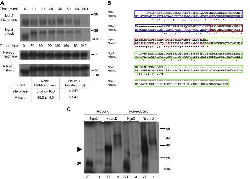 Fig. 1. Ngn2 is degraded whilst NeuroD is stable despite being ubiquitylated. (A) X. laevis interphase and mitotic egg extracts were supplemented with IVT 35S-labelled Ngn2 or NeuroD and incubated at 21 °C. Samples at increasing time points were analysed by SDSâPAGE followed by autoradiography and quantitative phosphorimaging analysis, calculating the half-lives using first-order rate kinetics, and errors calculated using the Standard Error of the Mean (SEM). n = 2. (B) ClustalW2 [20] analysis of sequences from Ngn2 and NeuroD. The N-terminal domain is bordered in blue; the bHLH domain in red; and the C-terminal domain in green. Lysine residues are highlighted in red. (C) Interphase egg extracts were supplemented with IVT 35S-labelled Ngn2 or NeuroD in the presence of MG132 and His6-ubiquitin and incubated at 20 °C for 90 min. Samples were bound to NiâNTA beads and subjected to SDSâPAGE in reducing or non-reducing conditions and analysed by autoradiography. Lanes are numbered 1â4 as described in the text. n = 2. (For interpretation of the references to colour in this figure legend, the reader is referred to the web version of this article.)