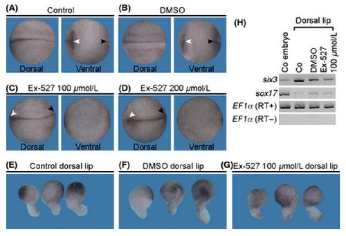 Figure 2. Ex-527 treatments reduced the size of neural plate region. (A) Control embryo at stage 17. (B) 0.25% of dimethylsulfoxide (DMSO)-treated embryo. In both cases, the pigmented midlines of neural plate were observed from the ventral side (15/15), and no edema formation was observed. (C) Embryo treated with 100 μmol/L of Ex-527. The pigmented midlines were located at the dorsal side (15/15). No obvious edema formation was detected. (D) Embryo treated with 200 μmol/L of Ex-527. The pigmented midlines were restricted at the dorsal side (15/15). Ventral edema formations were detected (12/15). White arrowhead shows the anterior end of the pigmented midline of neural plate and black arrowhead shows the posterior end of the side. (E) Dorsal lip explants cut from control embryos were cultured in 1ÃSS. Elongations were detected in 18/20 of explants. (F) Dorsal lip explants cut from control embryos were treated with 0.25% of DMSO. Elongations were detected in 17/20 of explants. (G) Dorsal lip explants cut from control embryos were treated with 100 μmol/L of Ex-527. Elongations were detected in 17/20 of explants. (H) reverse transcriptionâpolymerase chain reaction (RTâPCR) analyses for the expression of pan-neural marker six3 and endodermal marker sox17 in dorsal lip explants. Six3 expression was reduced by treatment of Ex-527, while sox17 expression was not.