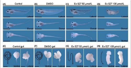 Figure 4. Ex-527 treatment induced severe gastrointestinal malformations. (A) Control embryo at stage 45. (B) Dimethylsulfoxide (DMSO)-treated embryo. (C) Embryo treated with 50 μmol/L of Ex-527. Ventral edema formations (11/12) and eye (11/12) and gastrointestinal malformation (12/12) were detected. (D) Embryo treated with 100 μmol/L of Ex-527. Ventral edema formations (11/11) and eye (11/11) and gastrointestinal malformation (11/11) were detected. (EâH) Surgically resected guts from embryos shown in AâD. The diagram of gut structure was shown on the left. These panels respectively indicate ventral and lateral views. Secondary coiled structure of gut was not detected in Ex-527-treated embryos. Scale bars of A to D represent 2 mm, and E to H 0.5 mm.