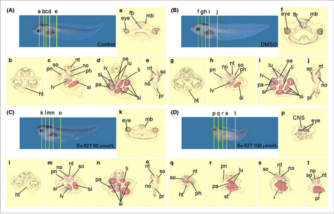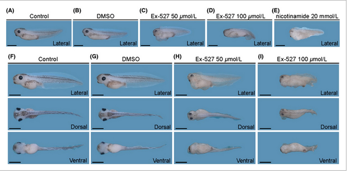 Figure 3. Ex-527 treatment induced edematous swelling, short body axis, and small head. (A,F) Control embryos at stage 38 and 41. (B,G) Dimethylsulfoxide (DMSO)-treated embryos. (C,H) Embryos treated with 50 μmol/L of Ex-527. Ventral edema formations (11/15) and eye malformations (12/15) were detected at stage 38 and 41. (D,I) Embryos treated with 100 μmol/L of Ex-527. Ventral edema formations (12/12) and eye malformations (12/12) were detected at stage 38 and 41. (E) Embryos treated with 20 mmol/L of nicotinamide. Ventral edema formations (16/18) and eye malformations (18/18) were detected at stage 38. Average lengths of embryos were decreased in dose-dependent manner. Scale bars of A to E represent 1 mm.