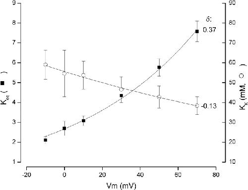 Figure 4. . Voltage dependence of the selectivity filter effective K+ equilibrium, Keq, and the inner vestibule K+ site affinity, KK. The Keq (▪) and KK (○) data were obtained as described in text. The lines are fits of Eq. 2 to the data. The electrical distance parameter, δ, for the selectivity filter equilibrium is 0.37, measured from the external side. The electrical distance for the vestibule site is 0.13 into the membrane electric field from the inner side, indicated by the minus sign. Other parameters from the fit are described in the text.