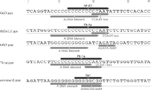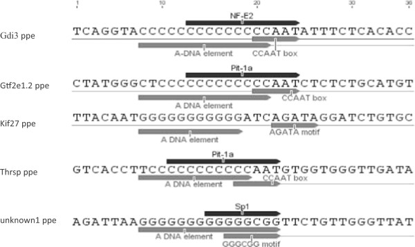 The five selected sequences and their predicted binding proteins. Each of the putative promoter elements (ppe) sequences are within 500 bp 5′ of the transcription start site of the genes-gdi3, gtf2, kif27, thrsp and unknown1, The key elements with potential gene regulatory function are underlined with grey arrows. The black arrow above each oligonucleotide indicates a putative transcription factor binding site and its direction of binding. The putative transcription factor binding sites were predicted using the EMBOSS database run through Geneious R7 7.1.4.