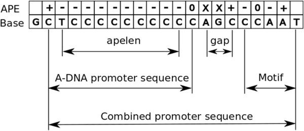 A combined promoter sequence consists of an A-form promoter element followed by a direct read-out promoter motif. The APE row indicates the signs of the APE values for the sequence in the Base row; with X denoting undetermined APE values [11]. The main parameters are the number of negative APE values in the APS (apelen), and the gap between the APS and the motif.