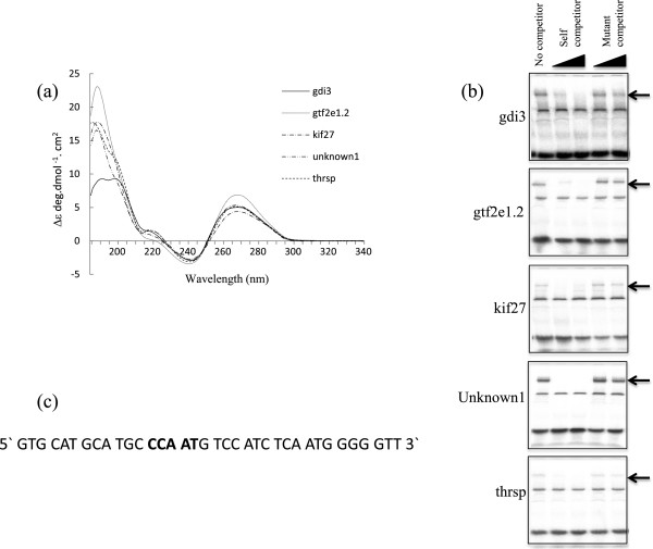 . (a) Duplex 36 bp oligonucleotides corresponding to the five identified putative promoter elements display A-form DNA characteristics as observed by circular dichroism. (b) These duplex oligonucletides are shifted in EMSA experiments, these complexes are competed by titration of unlabelled self-competitor but not by CCAAT box containing B-form duplexes. The specific complexes are indicated by arrows. (c) The sequence of the B-form competitor used in the EMSA is shown, the CCAAT box is indicated in bold.