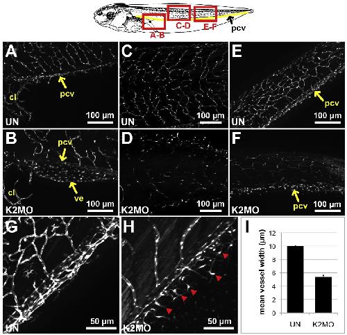 Fig. 5 â Angiogenesis and vascular maintenance was compromised in K2MO injected kdr:GFP transgenic tadpoles. Cartoon of stage 46 embryo (Nieuwkoop and Faber, 1967) with approximate locations of image fields depicted in labeled panels (red boxes). (AâH) Extended focus grid confocal micrographs of transgenic tadpoles imaged live. Panels are arranged so that dorsal is up and anterior is left. (A) Uninjected (UN) tadpoles had normal posterior cardinal veins (pcv) and an elaborate branched network of blood vessels throughout the trunk of the embryo including around the cloaca (cl). (B) K2MO morphants formed aberrant ventral edemas (ve) and swelling of the pcv. (CâF) Angiogenic sprouting of blood vessels was severely reduced in K2MO morphants compared to controls and the epithelial morphology of major blood vessels including the pcv was disrupted in K2MO morphants. (GâH) A magnified view of paired pcvs showing that in K2MO morphants, endothelial cells around the pcv appeared mesenchymal with multiple long protrusions (examples highlighted with red arrowheads), in stark contrast to the normal epithelial nature of endothelial cells at this region. (I) Quantification of the mean blood vessel width in uninjected compared to K2MO injected embryos; blood vessels widths observed in K2MO morphants were narrower than controls. For measurements, vessels were defined as a tubular stretch of endothelial cells between two branch points within the trunk of the embryo. Three width measurements were taken across the length of each vessel and averaged (UN: N = 8 tadpoles, n = 393 blood vessels; K2MO: N = 9 tadpoles, n = 80 blood vessels; error bars = SEM; p < 0.0001). |