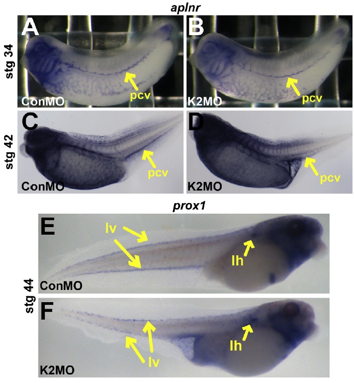 Fig. 4 â Knockdown of xkindlin2 resulted in impaired development of the embryonic vasculature and lymphatic system. (AâD) RNA in situ hybridization using aplnr as an endothelial cell marker. (AâB) Initial formation and elaboration of blood vessels including the posterior cardinal vein (pcv) was comparable between ConMO and K2MO morphants. (CâD) By stage 42, major vessels such as the pcv appeared to regress in K2MO morphants. (EâF) RNA in situ hybridizations using prox1 as a marker of the lymphatic system showed that lymph hearts (lh) and lymph vessels (lv) formed in both ConMO and K2MO morphants; discontinuities in prox1 expression are noted in K2MO embryos. |