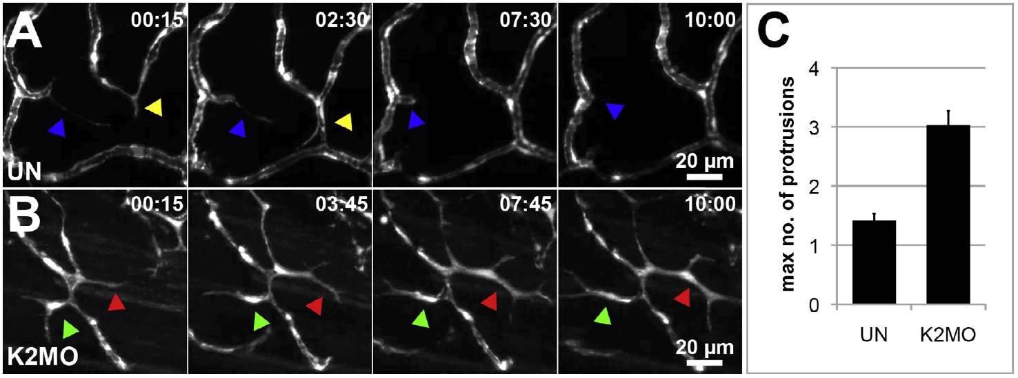 Fig. 6 â Increased endothelial cell protrusive activity and impaired angiogenic sprouting following loss of xkindlin2. (A-B) Selected frames from time-lapse movies of kdr:GFP transgenic tadpoles demonstrate endothelial cell behaviors from uninjected and K2MO injected embryos over 10 h. Each colored arrowhead points to a particular endothelial cell. The yellow arrowhead shows an endothelial tip-cell making a single protrusion that connected to a neighboring vessel to form a new branch. The blue arrowhead points to an endothelial cell that made 1â2 protrusions before retracting. Both behaviors are normal during this period of angiogenesis. The green and red arrowheads showendothelial cells fromK2MO morphants that made multiple protrusions but did not form new branches. These behaviors are readily observed in time lapse image sequences (Movies S3â4). (C) Quantification of the maximum number of protrusions observed for single endothelial cells during 10 h of imaging showed that K2MO caused a marked increase in the number of protrusions formed (UN: N = 5 tadpoles, n = 36 cells; K2MO: N = 3 tadpoles, n = 32 cells; error bars = SEM; p < 0.0001). |