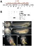 Fig. 1 â Developmental delays and aberrant gut morphology caused by loss of xkindlin1. (A) Sequence of K1MO used to target one alloallele of xkindlin1. (B) K1MO blocks translation of exogenously expressed Myc-tagged xkindlin1 RNA revealed by western blot with anti-Myc antibody. (CâD) ConMO (C) or K1MO (D) injected embryos at gastrula stage, appearance of blastopore indicates normal timing and morphology. (EâF) ConMO injected normal tadpole stage embryo (E); K1MO embryo is delayed with general ââsicklyââ appearance (F). (GâH) Gut morphology (yellow arrows) in late tadpole embryos reveals normal gut coils in uninjected (UN) tadpoles (G); K1MO injected tadpoles exhibited deformed guts with significantly reduced coiling (H). |