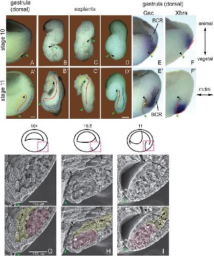 min (B) after explantation, viewed from inside the embryo (left, respective sagittal section views of fixed explants, for orientation). Animal to the top, green arrowhead, tip of lip; black arrowhead, bottle cell position. (C-F) Higher magnification of squares in A,B. Arrowheads and lines indicate pathways of landmarks. Sequential appearance of landmarks indicates involution, pathways converge towards midline. (G-Hâ²) Mesoderm regions identified by Gsc and Xbra expression in explants. Arrowheads, red and yellow lines as in Fig. 1E,F. Animal to the top, dorsal to the right. Scale bars: 100â