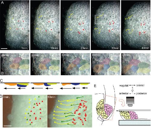 Fig. 3. Open-faced lip-BCR explants. (A) Cell movements in early gastrula explant. Cells at anterior (former vegetal) edge (left) migrate anteriorly (yellow arrows), narrowing and extending the lip tissue. Posterior cells show minor movement (red arrows). (B) Higher magnification of region in A (white rectangle), cell (blue) appears between cells moving apart, and lateral cell neighbors (red, orange) become anteroposterior neighbors. (C) Intercalation by differential migration. (D) Decreasing cell velocities from anterior (yellow) to posterior (green, red). (E) Interpretative scheme. Yellow, Gsc domain; red, Xbra domain. Explant (dashed rectangle) is secured under coverslip. Arrow lengths indicate velocities: long, outer lanes; short, inner lanes through lip. Vegetal-animal axis becomes anterior-posterior axis after involution. Scale bars: 100â