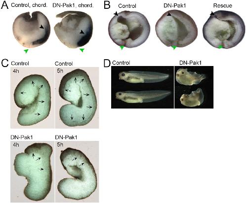 Fig. 10. Resumption of convergent extension after failed involution. (A) Chordin expression in control and DN-Pak1-injected embryos in late gastrula (stage 12). (B) Archenteron after completion of gastrulation in control and Pak1-inhibited embryos. Black arrowheads, positions of bottle cells; green arrowheads, blastopore. (C) Control and Pak1-inhibited lip-BCR explants cultured for 4 and 5â