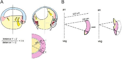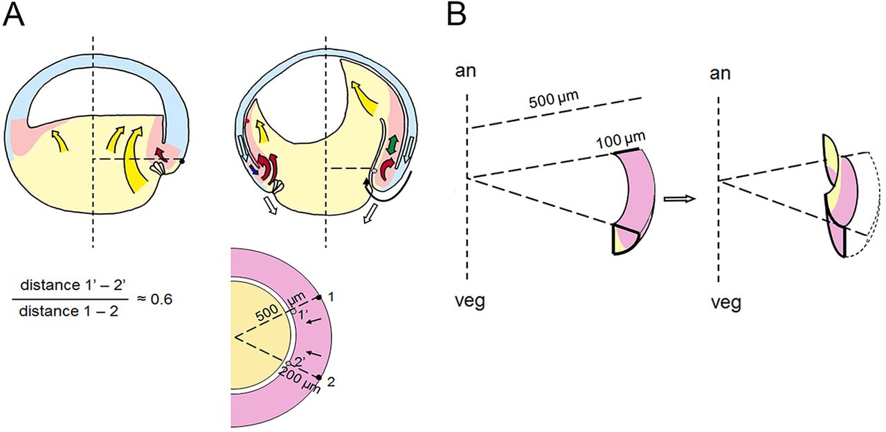 Fig. 11. Geometry of dorsal involution. (A) Involution in context of gastrulation. Top: movements at early and mid-gastrula stages. Yellow, endoderm; red, mesoderm; blue, ectoderm; yellow arrows, vegetal rotation; red arrows, involution; blue arrows, epiboly; green double-arrow, late-stage convergent extension; white arrows, vegetal displacement of lips during blastopore constriction; vertical dashed line, animal-vegetal axis. Bottom: horizontal section at level of horizontal dashed lines in top, dorsal side. Dashed lines connect surface cells 1 and 2 to animal-vegetal axis, over a distance of 500â