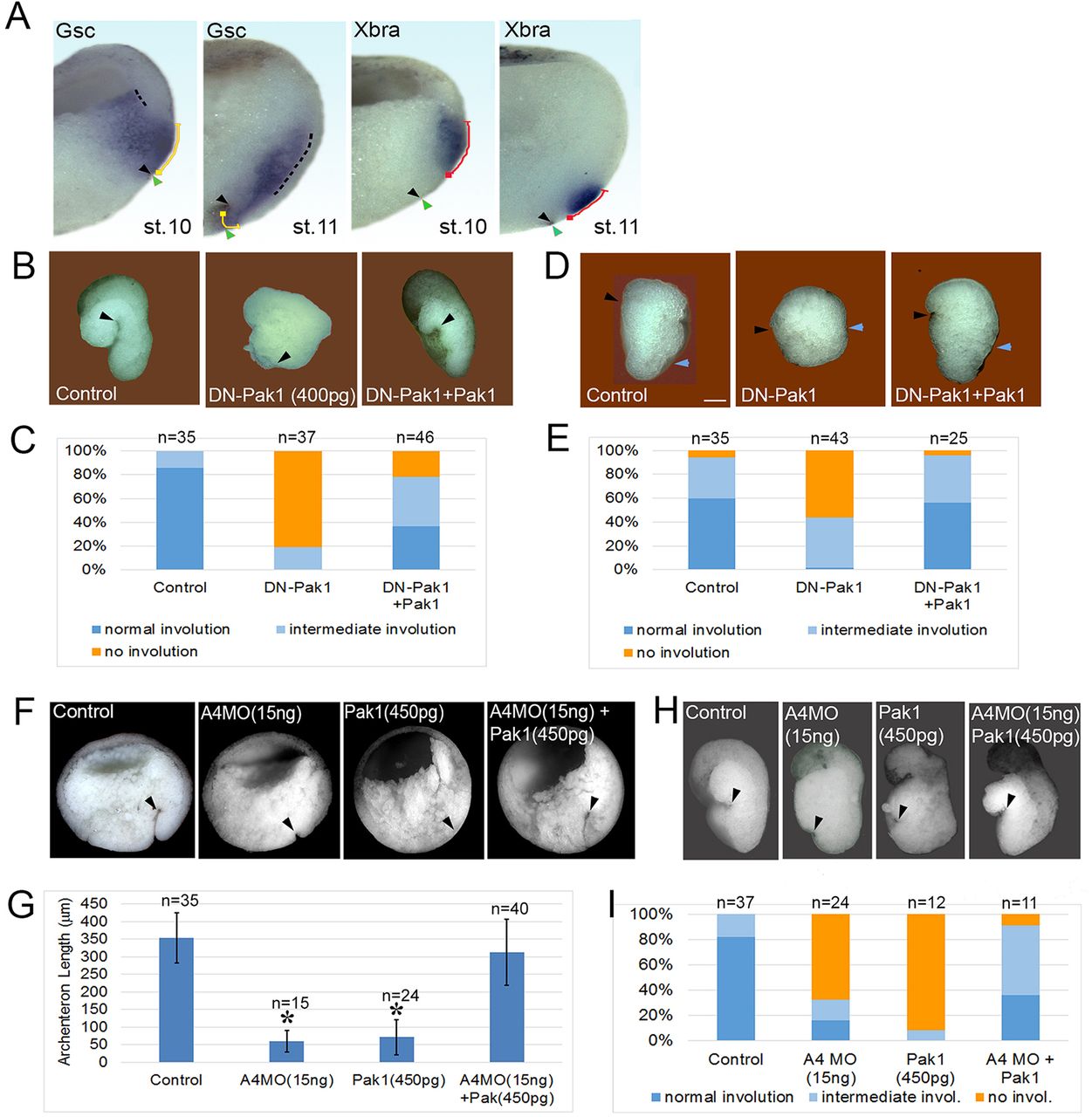 Fig. 6. Pak1 acts downstream of EphA4. (A) In situ hybridization for Gsc and Xbra in DN-Pak1 embryos. Arrowheads, lines as in Fig. 1. (B,C) Pak1 inhibition in lip-BCR explants. (D,E) Pak1 inhibition in lip-only explants. (F) Embryos fractured sagittally after peak involution, rescue of EphA4-MO effect by Pak1. (G) Archenteron lengths in experiments shown in F; n, number of embryos; bars indicate s.d.; asterisks indicate significance levels at least P<0.05. (H) Lip-BCR explants. (I) Involution defects in lip-BCR explants; n, number of explants. Black arrowheads, bottle cells positions; green arrowheads, blastopore; blue arrowheads, border between BCR and blastopore lip. |