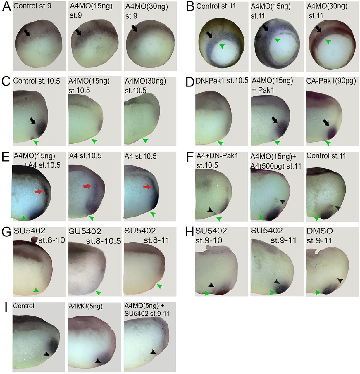 Fig. 7. Xbra expression as detected by in situ hybridization. Treatments and stages indicated in A-I. Black arrowheads, positions of bottle cells; green arrowheads, blastopore; black arrows, Xbra expression in lip region; red arrows, ectopic Xbra expression in anterior mesoderm or BCR. |