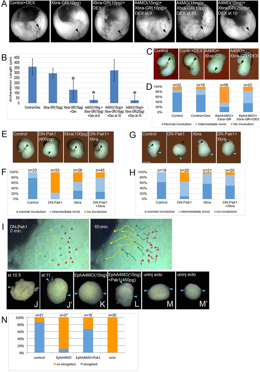 Fig. 8. Xbra acts downstream of EphA4/Pak1. (A) Embryos fractured sagittally after peak involution (stage 11); rescue of archenteron formation by Xbra-GR/dexamethasone (DEX). Arrowheads, end of archenteron. (B) Archenteron lengths; n, number of embryos; bars indicate s.d.; asterisks indicate significance levels at least P<0.05. (C,D) Lip-BCR explants, rescue of folding by Xbra-GR; n, number of explants. (E,F) Lip-BCR explants, rescue of folding by Xbra mRNA injection after Pak1 inhibition; n, number of explants. (G,H) Rescue of lip-only morphology by Xbra mRNA injection after Pak1 inhibition; n, number of explants. (I) Migration of cells in anterior open-faced explants (yellow and green arrows) is not inhibited by DN-Pak1. Red arrows, random motility in Xbra domain. (J-N) Asymmetric elongation in Xbra domain explants (J,Jâ²) is inhibited by EphA4 knockdown (K) and rescued by Pak1 (L); no elongation in ectoderm explants of different sizes (M,Mâ²). Scale bars: 100â