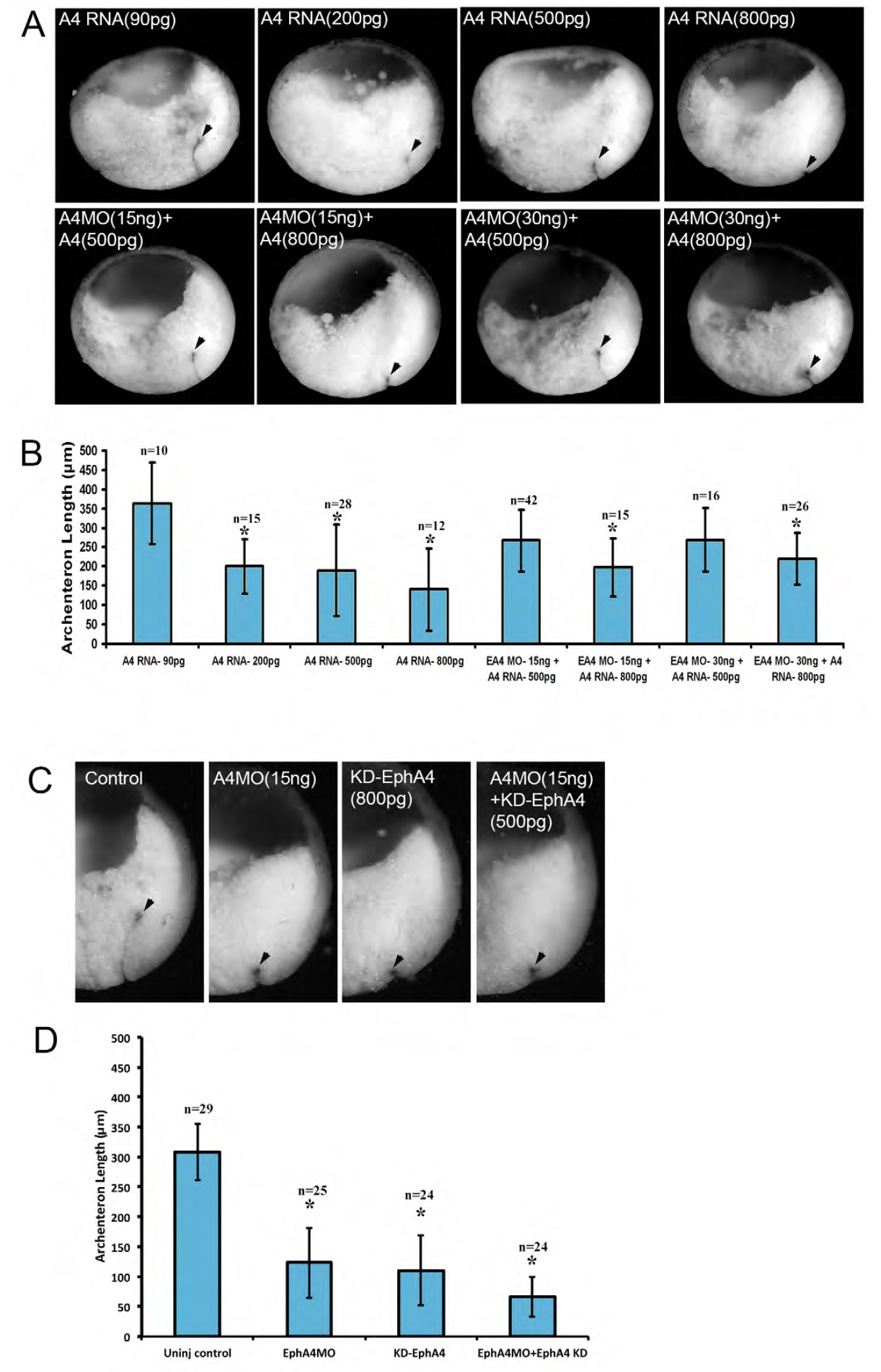 Fig. 5. EphA4 knockdown inhibits peak involution. (A) Embryos fixed and fractured sagittally after peak involution (stage 11) after injection with EphA4-MO and/or EphA4 mRNA at doses indicated. Arrowheads, position of bottle cells at end of archenteron. (B) Archenteron lengths in experiments shown in A; n, number of embryos; bars indicate s.d.; asterisks indicate significance levels at least P<0.05. (C) Lip-BCR explants, sagittal view. Treatments indicated; lengths of involuted surface indicated by dashed line. (D) EphA4-MO-injected lip-BCR explants fixed 1 and 2.5â