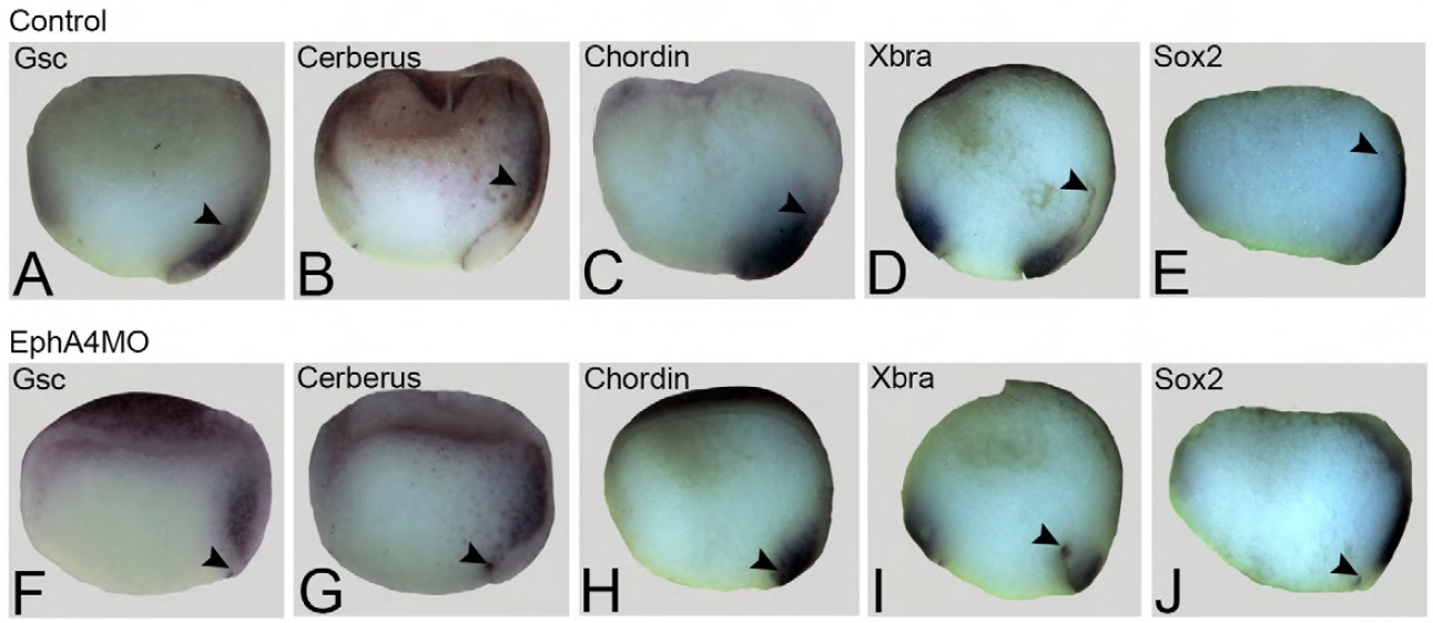 Figure S2. Marker gene expression in control (A-E) and EphA4-MO embryos (F-J) at