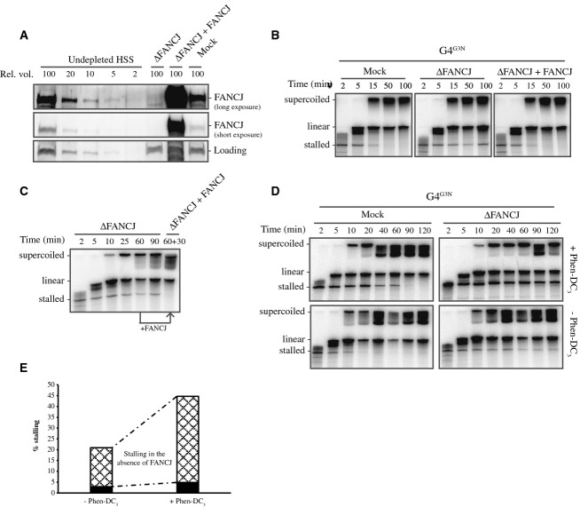 Our genome contains many G-rich sequences, which have the propensity to fold into stable secondary DNA structures called G4 or G-quadruplex structures. These structures have been implicated in cellular processes such as gene regulation and telomere maintenance. However, G4 sequences are prone to mutations particularly upon replication stress or in the absence of specific helicases. To investigate how G-quadruplex structures are resolved during DNA replication, we developed a model system using ssDNA templates and Xenopus egg extracts that recapitulates eukaryotic G4 replication. Here, we show that G-quadruplex structures form a barrier for DNA replication. Nascent strand synthesis is blocked at one or two nucleotides from the G4. After transient stalling, G-quadruplexes are efficiently unwound and replicated. In contrast, depletion of the FANCJ/BRIP1 helicase causes persistent replication stalling at G-quadruplex structures, demonstrating a vital role for this helicase in resolving these structures. FANCJ performs this function independently of the classical Fanconi anemia pathway. These data provide evidence that the G4 sequence instability in FANCJ(-/-) cells and Fancj/dog1 deficient C. elegans is caused by replication stalling at G-quadruplexes.