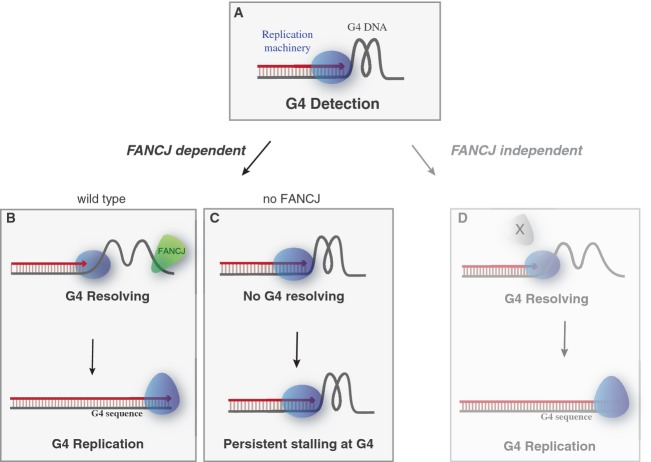 FANCJ promotes DNA synthesis through G-quadruplex structures.