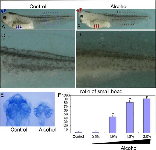 RESULTS: Pre-gastrulation exposure of 2-4% alcohol induces apoptosis in Xenopus embryo whereas 1% alcohol specifically impairs neural crest migration without observing discernible apoptosis. Additionally, 1% alcohol treatment considerably increased the phenotype of small head (43.4% ± 4.4%, total embryo n = 234), and 1.5% and 2.0% dramatically augment the deformation to 81.2% ± 6.5% (n = 205) and 91.6% ± 3.0% (n = 235), respectively (P < 0.05). Significant accumulation of Homocysteine was caused by alcohol treatment in embryos and 5-mehtyltetrahydrofolate restores neural crest migration and alleviates homocysteine accumulation, resulting in inhibition of the alcohol-induced neurocristopathies.