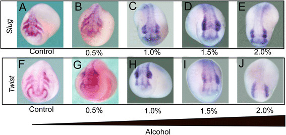 Figure 3. Alcohol exposure disrupts neural crest migration. (A) Both slug and twist1 in situ hybridization, performing along with gradient alcohol treatment, displays neural crest migration is accordingly blocked by the increasing concentration of alcohol. (B,G) indicates 0.5% alcohol treatment still allows fairly migration of neural crest versus control embryos (A,F). 1.0% alcohol treatment deteriorate the egressing process of neural crest, however, there is perceivable migration occurring (C,H). Finally, both 1.5% and 2.0% appears completely freezing the migration (D,E,I,J).
