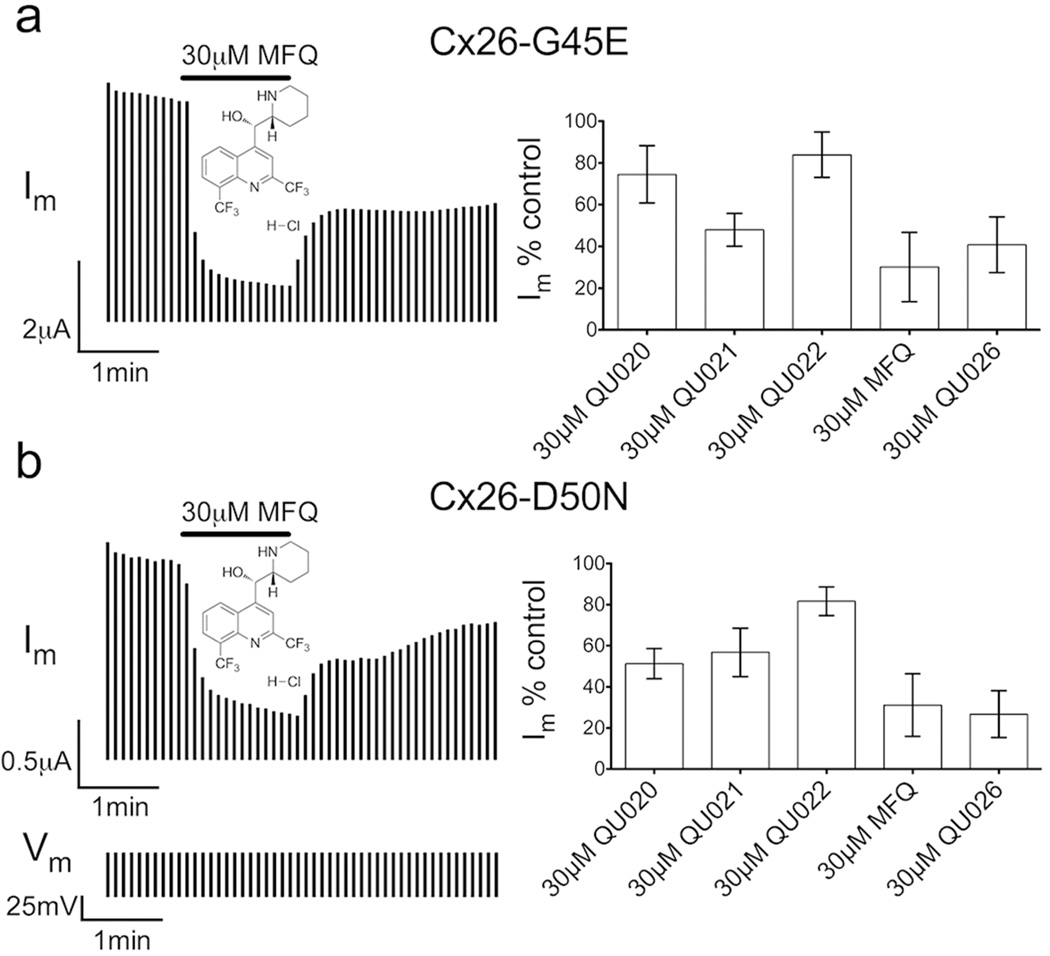 Figure 2. Mefloquine (MFQ) and quinine derivatives (QUO) suppressed (a) Cx26-G45E and (b) -D50N hemichannel currents in Xenopus oocytesSingle cells held at −40mV were repeatedly pulsed with +50mV depolarizations (Vm) and membrane current (Im) was measured. Cells were exposed to 30µM inhibitor for 90sec by switching perfusion solutions after lmin (left, shown for mefloquine). Inhibitors were washed out for 2.5min, showing partial reversibility at the concentration tested. Summary data for inhibitors QU020, QU021, QU022, MFQ, and QU026 are shown as the mean residual instantaneous membrane current during 30µM drug application as a percentage of the pre-drug value (right). MFQ and QU026 produced the greatest inhibition of Cx26-G45E and -D50N membrane currents. Data are the means ± SD.