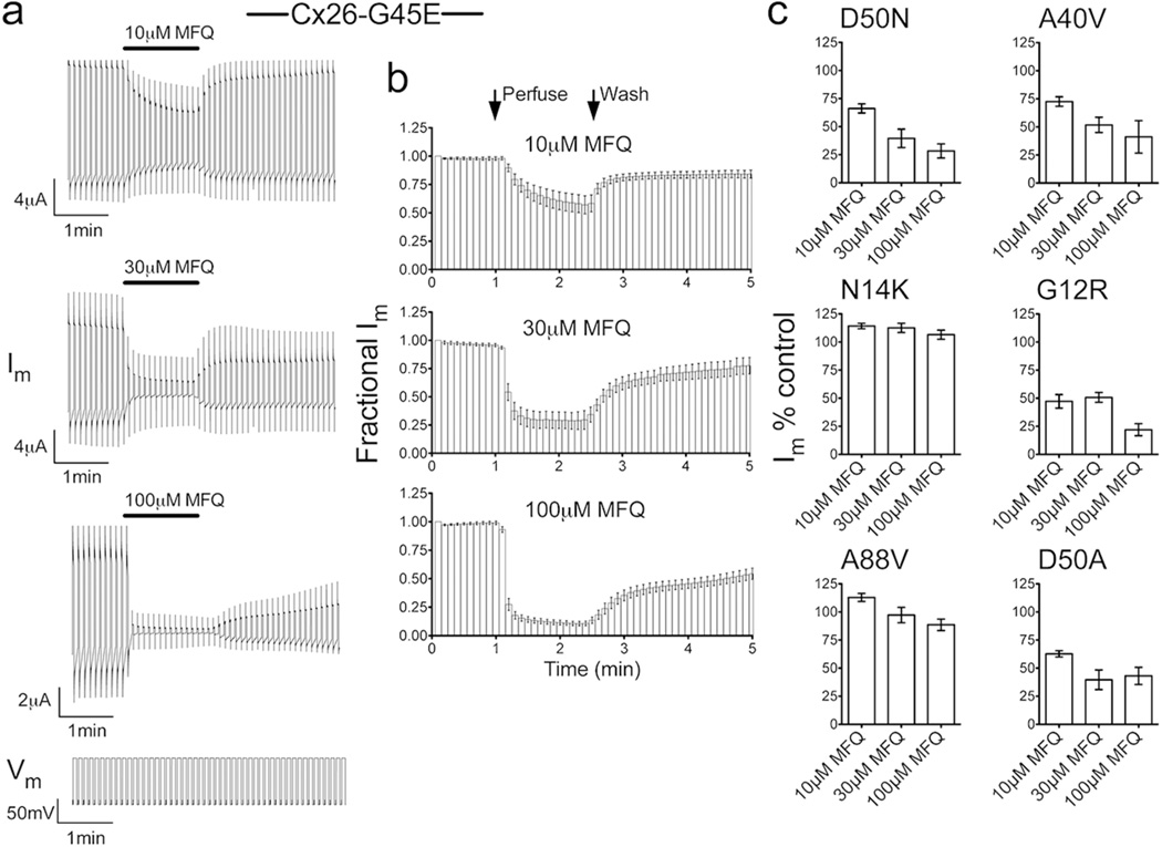 Figure 3. Mefloquine (MFQ) attenuated KID-associated Cx26 hemichannel currents in a concentration-dependent and mutant-selective manner(a) Voltage-clamp recordings for three cells expressing Cx26-G45E showed an increasing magnitude of membrane current (Im) inhibition with 10, 30, and 100µM MFQ. (b) Mean MFQ response characteristics across Cx26-G45E-expressing cells showed that membrane current, plotted as a fraction of the starting value, fell by >25%, >50%, and >75% upon exposure to 10 (N=5), 30 (N=5), and l00µM (N=10) MFQ, respectively, (c) Effect of 10, 30, and 100µM MFQ perfusion on cells injected with Cx26-D50N, -A40V, -N14K, -G12R, -A88V, and -D50A. Bars represent the mean membrane current in the presence of the inhibitor as a percentage of the pre-drug value (n=5). Data are means ± SEM.