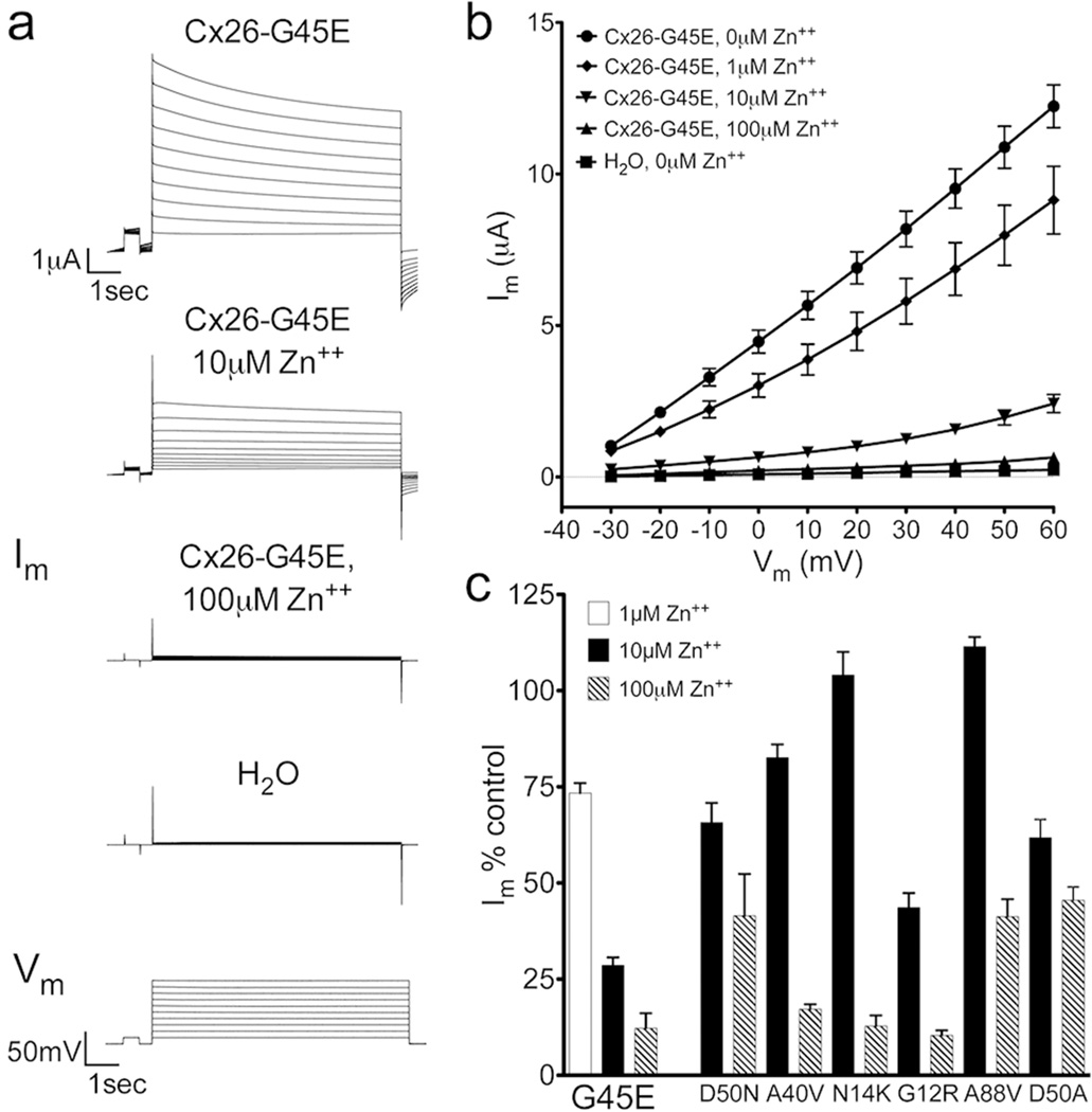 Figure 4. Extracellular zinc (Zn++) reduced hemichannel currents mediated by KID-causing Cx26 mutations(a) Representative current (Im) traces corresponding to a single Cx26-G45E-expressing cell recorded in the presence of 0, 10, and 100µM Zn++. An h2O-injected control cell is shown for comparison, (b) Mean currents plotted against membrane potential (Vm) illustrated current-voltage relationships. Control cells showed negligible current (N=10). Whole-cell currents observed in Cx26-G45E oocytes (N=16) were inhibited by addition of 1 (N=5), 10 (N=5), and 100µM (N=5) Zn++ to the medium, (c) Concentration dependent effects of zinc perfusion in cells expressing Cx26-G45E, -D50N, -A40V, -N14K, -G12R, -A88V, and -D50A. Bars represent the mean current as a percentage of the pre-drug value for five cells. Data are means ± SEM.