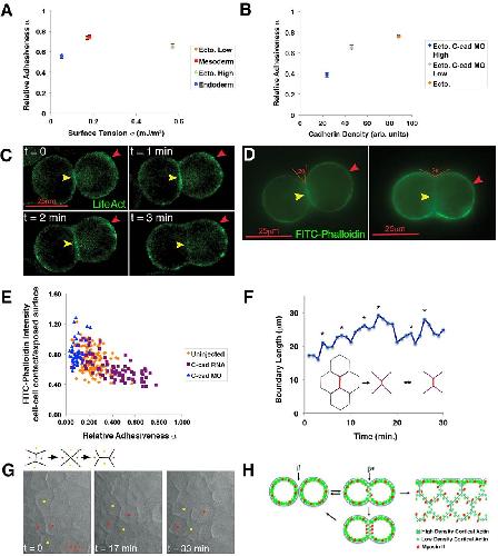 Fig. 2. Cell adhesion and fluctuations. (A) Relative adhesiveness α as a function of surface tension of gastrula tissues. (B) Relative adhesiveness α as function of cadherin density in normal or C-cad-MO-injected (3 and 10â ng/embryo) ectoderm from early gastrula. Averages and s.e.m. from three experiments. (C) Ectoderm cells expressing LifeAct (green) during contact formation. Yellow arrowheads indicate actin cortex at contact; red arrowheads indicate exposed surface cortex. (D) Ectoderm cell pairs more than 20â min after contact formation, with randomly varying small (left) or large (right) contact angle, for comparison of phalloidin-stained F-actin cortex density at exposed (red arrowheads) and contact (yellow arrowheads) surfaces. (E) Ratio of cortex density at contacts (half the measured density, as both cells contribute) versus free surface as a function of relative adhesiveness α=1âcosθ. Cell pairs as in D from uninjected, C-cad-MO-injected (10â ng/embryo) and C-cadherin mRNA-injected ectoderm from early gastrula are compared. The average ratio of cytoplasmic to exposed cortex F-actin intensity is 0.42; a decrease of contact-to-exposed ratios below this level is difficult to detect. (F) Cell-cell contact length fluctuation (red in explanatory diagram) in an ectoderm cell. The inverse of the time between peaks (asterisks) corresponds to the fluctuation frequency. (G) Spontaneous T1 cell rearrangement in an explant of prechordal mesoderm, viewed at incident light. Two cells labelled by red dots separate, allowing cells with yellow dots to establish new contact. (H) Model showing cortical density changes during cell adhesion, cell detachment and in aggregates, and cell detachment due to myosin-dependent boundary contraction.