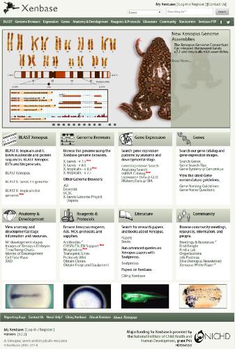 Xenbase (http://www.xenbase.org), the Xenopus frog model organism database, integrates a wide variety of data from this biomedical model genus. Two closely related species are represented: the allotetraploid Xenopus laevis that is widely used for microinjection and tissue explant-based protocols, and the diploid Xenopus tropicalis which is used for genetics and gene targeting. The two species are extremely similar and protocols, reagents and results from each species are often interchangeable. Xenbase imports, indexes, curates and manages data from both species; all of which are mapped via unique IDs and can be queried in either a species-specific or species agnostic manner. All our services have now migrated to a private cloud to achieve better performance and reliability. We have added new content, including providing full support for morpholino reagents, used to inhibit mRNA translation or splicing and binding to regulatory microRNAs. New genomes assembled by the JGI for both species and are displayed in Gbrowse and are also available for searches using BLAST. Researchers can easily navigate from genome content to gene page reports, literature, experimental reagents and many other features using hyperlinks. Xenbase has also greatly expanded image content for figures published in papers describing Xenopus research via PubMedCentral.