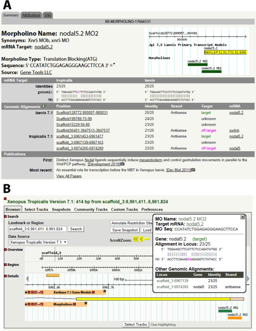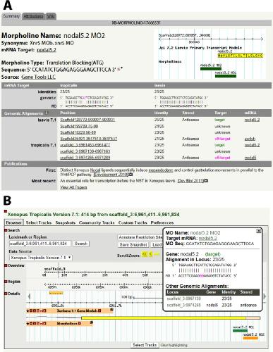 The new morpholino support interface. We store data on over 1000 morpholino reagents, gathered from large-scale screens and the Xenopus literature. (A) Each morpholino sequence is aligned to the genome via BLAST and the results for both on-target and potential off-target matches displayed. Various other data, such as publications, utilizing the reagent are also illustrated. (B) Morpholino sequences are also available as a track in our GBrowse implementation. When a user clicks on a morpholino in the browser details on the alignment are displayed in a pop-up window.