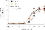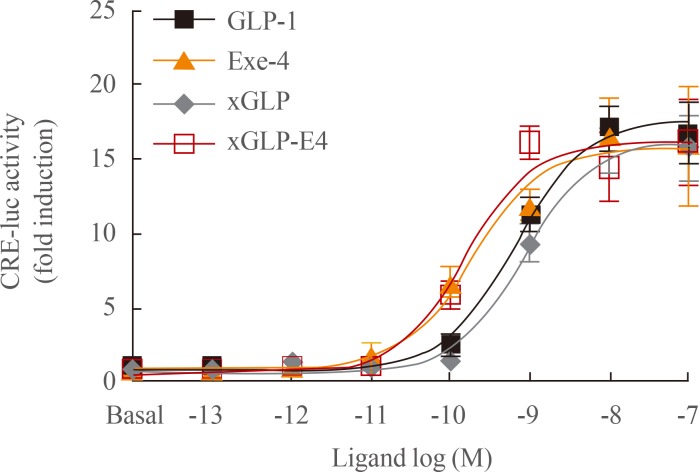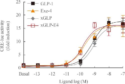 Fig. 1. Potency of glucagon-like peptide-1 (GLP-1) analogs toward GLP-1 receptor (GLP1R). Ligand potencies of GLP-1 analogs were examined using HEK293T cells expressing GLP1R. Cells were treated with increasing concentrations of GLP-1 analogs for 6 hours, and luciferase activity was measured. The data on the sigmoidal curves and EC50 values are presented as means±standard error of the mean of at least three independent experiments. CRE-luc, cAMP response element-luciferase; xGLP, Xenopus GLP-1.