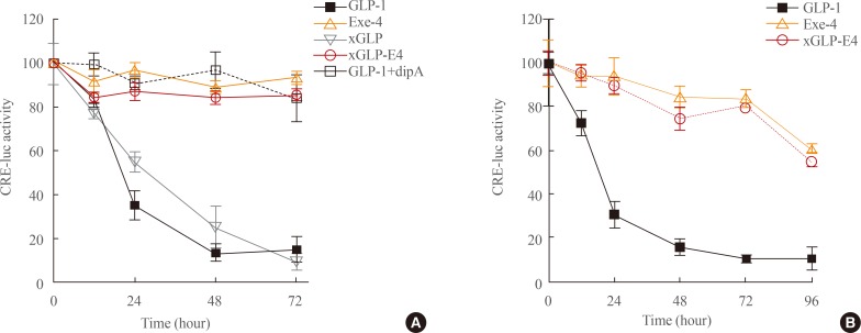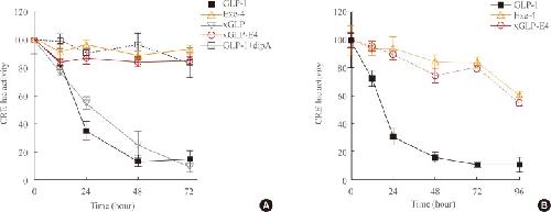 Fig. 2. Stability of glucagon-like peptide-1 (GLP-1) analogs. The stability of GLP-1 and GLP-1 analogs against dipeptidyl peptidase-IV (DPP-IV) activity was evaluated by incubating the individual peptides in medium containing 10% fetal bovine serum (FBS) (A) or in 100% FBS (B). Peptides were incubated at an initial concentration of 100 nM in Dulbecco's Modified Eagle's medium containing 10% FBS or 100% FBS at 37℃ in the presence or absence of 0.2 mM of the peptidase inhibitor diprotin A. Peptide activity was then assessed by measuring luciferase activity in cells expressing GLP1R and CRE-luc. Results are presented as mean±standard error of the mean of at least three independent experiments.