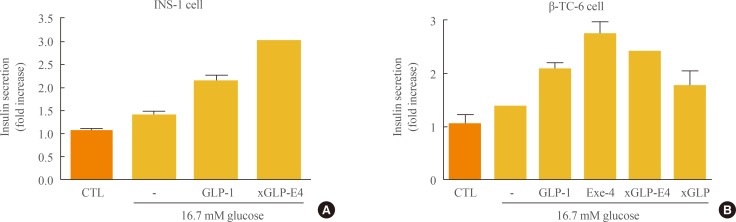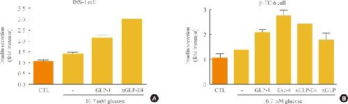 Fig. 3. Induction of glucose-dependent insulin secretion by (xGLP-E4). (A) INS-1 cells and (B) β-TC-6 cells were cultured in 24-well plates until 90% confluence. Cells were washed and incubated in Krebs-Ringer Bicarbonate (KRB) buffer and treated with glucose for 2 hours at 37℃. Cells were incubated with 10 nM glucagon-like peptide-1 (GLP-1) analog in KRB buffer containing low and high glucose for another 2 hours, and insulin secretion into the buffer was then determined. CTL, control; GLP-1, glucagon-like peptide-1; Exe-4, exendin-4; xGLP, Xenopus GLP-1.