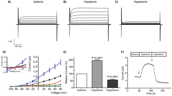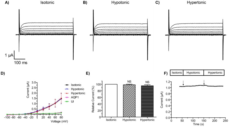 Figure 2. Sensitivity of Slack channels to changes in cell volume.Slack channels were co-expressed with AQP1 in Xenopus laevis oocytes and activated with a voltage protocol, as described in figure 1, under isotonic (A), hypotonic (B) and hypertonic media (C). (D) shows the corresponding I/V curves under isotonic (black), hypotonic (blue) and hypertonic (red) conditions. Control experiments for native, un-injected oocytes (UI, green) and oocytes only expressing AQP1 (violet) are also shown. In (E), maximal currents were measured at the end of the +80 mV depolarizing step under isotonic, hypotonic and hypertonic buffers and the currents were normalized to the current measured at isotonic conditions. Data points in panels (D) and (E) show the mean of 10 independent experiments ± S.E.M. (F) shows a current trace over time for a representative oocyte expressing Slack and AQP1. The channels were activated by a protocol as described in figure 1.