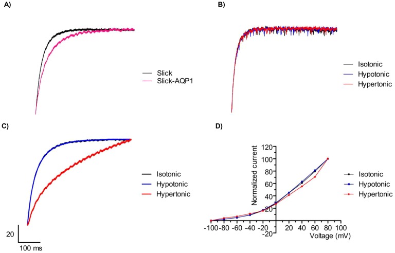 Figure 3. Kinetics of Slick channels during regulation by cell volume changes.(A) Slick channels (Slick, black) or Slick channels and AQP1 (Slick+AQP1, red) were expressed in Xenopus laevis oocytes and were kept at a holding potential of −80 mV before the channels were activated by depolarization to +80 mV (500 ms). The recorded currents were normalized to the maximal current measured in each experiment at the end of the +80 mV depolarization period for two representative oocytes. (B) oocytes expressing Slick channels in absence of co-expressed AQP1 were activated by depolarizations to +80 mV as before in isotonic (black), hypotonic (blue) and hypertonic (red) media, and currents were normalized to the maximal current. The figure shows the result of one representative experiment. (C) the experiments shown in (B) were repeated with oocytes co-expressing Slick channels and AQP1 channels (in isotonic (black), hypotonic (blue) and hypertonic (red) media). The figure shows the result of one representative experiment (Note: the currents measured in isotonic and hypotonic media are precisely superimposed). (D) a representative oocyte co-expressing Slick and AQP1 was exposed to isotonic (black), hypotonic (blue) and hypertonic (red) media and in each medium Slick channels were activated by a depolarization protocol as in figure 1. The figure shows the resulting IV-curves, each normalized to the maximal current (found at +80 mV).