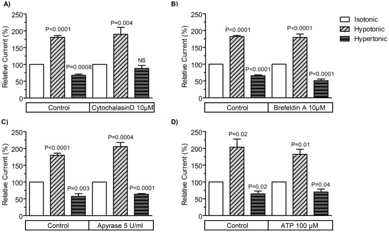Figure 4. Mechanisms for cell volume regulation of Slick K+ channels.Slick channels were co-expressed with AQP1 in Xenopus laevis oocytes and the channels were activated by depolarizations to +80 mV for 500 ms (holding potential: −80 mV). In all cases, the maximal currents (at the end of the depolarization period) were measured in isotonic, hypotonic and hypertonic media and are shown as relative changes in the current during cell swelling (hatched bars) and shrinkage (horizontal bars) as compared to the current under isotonic conditions (open bar). The figures show the effect of (A) cytochalasin D (10 µM, preincubation 24 hours), (B) Brefeldin A (10 µM, preincubation 8 hours), (C) Apyrase (5 U/ml) and (D) ATP (100 µM). All values are given as means ±SEM (n = 6–8).