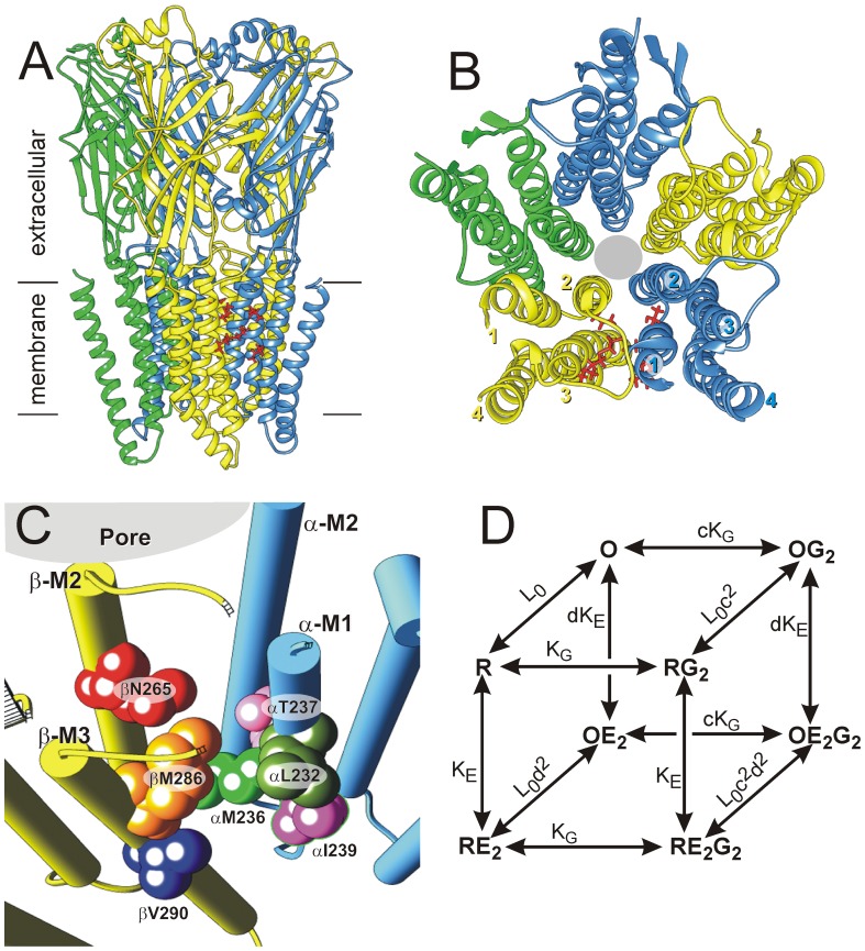 [20]. Both the extracellular domains and transmembrane domains are shown in relation to membrane lipids. Subunits are color-coded (α1â=âblue; β3â=âyellow; γ2Lâ=âgreen). βN265 and other residues involved in etomidate and propofol binding are depicted as red stick structures in one of two β+/αâ transmembrane interfacial sites. Panel B: A view of the transmembrane domains from the extracellular space shows the structure of each subunitâs four-helix bundle and the arrangement of subunits around the central chloride channel (grey circle). Residues in one interfacial anesthetic site are depicted as red stick structures. Panel C: A close-up view of one β+/αâ transmembrane inter-subunit etomidate binding site in the homology model. Helix backbones are depicted as solid cylinders. The βN265 residue and six anesthetic contact residues identified by photolabeling or cysteine modification/protection are highlighted as labeled space-filling structures. Panel D: A Monod-Wyman-Changeux two-state (inactiveâ=âR; activeâ=âO) equilibrium co-agonist scheme with two equivalent orthosteric agonist (GABA; G) sites and two equivalent allosteric agonist (etomidate; E) sites is depicted [1]. For simplicity, states with only one occupied agonist site are omitted. The model is defined by five equilibrium parameters (see Eq. 3, methods): L0 is a basal gating equilibrium (C/O); KG and KE are dissociation constants for respectively, GABA and etomidate binding to inactive receptors; c and d quantify the binding affinity ratios for respectively, GABA and etomidate to active vs. inactive receptors. Maximal agonist efficacies for GABA and etomidate are respectively, (1+L0c2)â1 and (1+L0d2)â1.