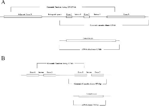 Figure 2. Maps showing the organization of Symbiodinium sPCP tandem genes containing introns and the corresponding cDNAs.(A) Long sPCP genes from clade B/B1 and B19 descendant isolates contained two introns. The CDS identified in genomic and cDNA clones was ∼1.1 kb. (B) Short sPCP genes from S. microadriaticum (clade A/A1) had one intron and the CDS was ∼600 bp.
