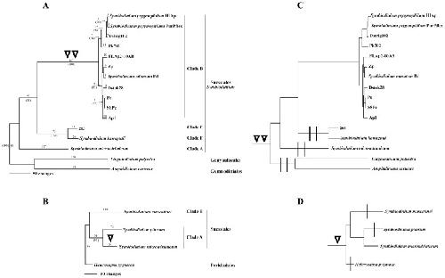 Figure 4. Phylogenies of long and short sPCP coding sequences (excluding introns) from four dinoflagellate orders.(A) Most parsimonious tree for long sPCP CDS data from the Suessiales, Gonyaulacales and Gynnodiniales. (B) Most parsimonious tree for short sPCP CDS from the Suessiales and Peridiniales. Branch lengths are shown above the branches. Support values >50% based on +1000 bootstrap trees are shown in parentheses below branches. Double inverted triangles = the long sPCP branch leading to Symbiodinium clade B sequences, each of which contained two introns. Single inverted triangle = the short sPCP branch for the S. microadriaticum sequence that had a single intron. (C) Long sPCP tree redrawn to indicate possibility of ancient introns present in the most recent common ancestor of Suessiales, Gonyaulacales and Gynnodiniales. Vertical bar = loss of an intron on an ascending branch required to explain the data. (D) Short sPCP tree redrawn to indicate possibility of an ancient intron present in the most recent common ancestor of Suessiales and Peridinales. Required losses on ascending branches are indicated as before.