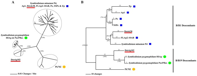 Figure 3. Phylogenies of Symbiodinium clade B long sPCP cassette sequences.(A) Maximum likelihood tree of all non-chimeric clones. (B) Most parsimonious tree of most frequently recovered non-chimeric clones. Branch lengths for the most parsimonious tree are shown above the branches. Support values >70% based on +1000 bootstrap trees are shown in parentheses. Support values for minor branches of the maximum likelihood tree are not displayed. Blue squares = B/B1/B184; Green circles = B/B2/B224 (descendant of B/B19); Orange circles = B/B19/B211. The positions of Dstok28 and Dstrig102 are underlined in red. The topologies of both trees are congruent with each other.
