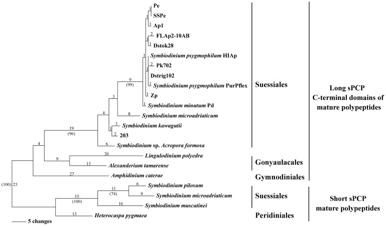 Figure 5. Phylogeny of short and long sPCP predicted amino acid sequences from four dinoflagellate orders.The most parsimonious tree shows unambiguous resolution of short and long sPCP sister clades. Branch lengths are shown above the branches. Support values >70% based on +1000 bootstrap trees are shown in parentheses below branches. The long sPCP genes were produced from fusion of duplicated short sPCP genes that occurred once early during the evolution of peridinin-containing dinoflagellates. Thereafter, short and long sPCP genes and corresponding polypeptides diverged.