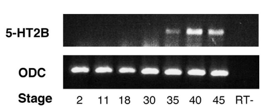 Fig. 2. Developmental expression of 5-HT2B receptor mRNA. RT-PCR reactions were carried out with equal amounts of total RNA preparations from the different embryonic and larval stages (as indicated). Ornithine decarboxylase (ODC) amplification was used as control of the reaction (bottom panel). A-RT minus negative control is shown.