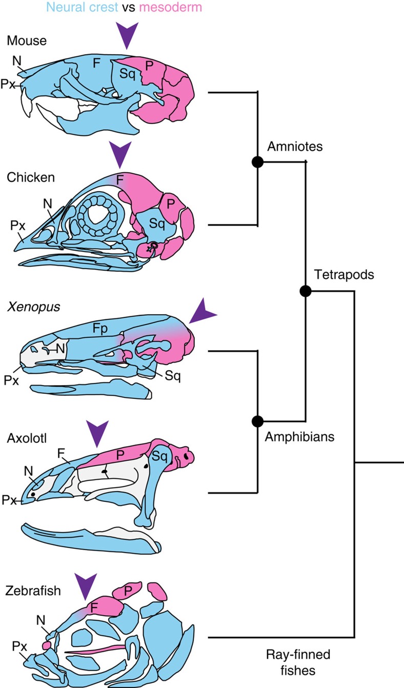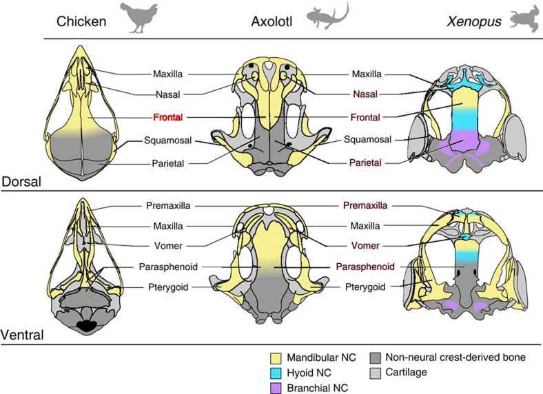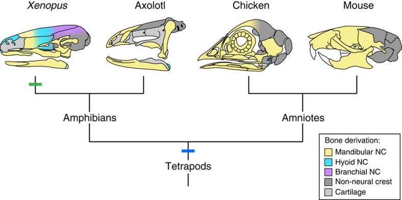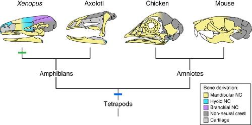 Development of the vertebrate skull has been studied intensively for more than 150 years, yet many essential features remain unresolved. One such feature is the extent to which embryonic derivation of individual bones is evolutionarily conserved or labile. We perform long-term fate mapping using GFP-transgenic axolotl and Xenopus laevis to document the contribution of individual cranial neural crest streams to the osteocranium in these amphibians. Here we show that the axolotl pattern is strikingly similar to that in amniotes; it likely represents the ancestral condition for tetrapods. Unexpectedly, the pattern in Xenopus is much different; it may constitute a unique condition that evolved after anurans diverged from other amphibians. Such changes reveal an unappreciated relation between life history evolution and cranial development and exemplify 'developmental system drift', in which interspecific divergence in developmental processes that underlie homologous characters occurs with little or no concomitant change in the adult phenotype.