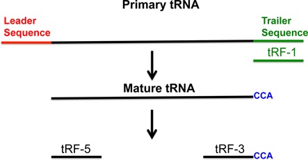 Figure 1. Illustration of primary tRNA, mature tRNA and tRF-5, -3 and -1. tRF-1 (shown in green) is generated from primary tRNA. tRF-5 and -3 are produced from mature tRNA. The tRF-3s always have âCCAâ at their 3â² end.
