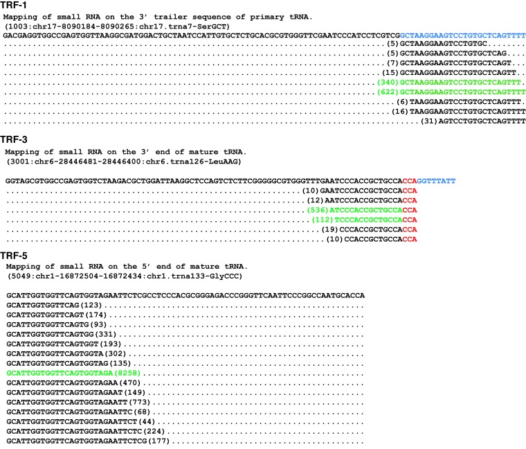 Figure 2. The patterns of small RNA deep sequencing reads (GSM416733) mapping to tRNA genes. Examples of small RNA reads that mapped to specific tRNAs are shown. More than 80% of reads for a given tRF-1, -3 or -5 represent one or two most abundant reads and this is the read that is included as the main tRF sequence in the database. The most abundant clones are shown in green. Upper: tRF-1-like sequences mapping to the primary tRNA chr17.trna7-SerGCT. Middle: tRF-3-like sequences mapping to the mature tRNA chr6.trna126-LeuAAG. Lower: tRF-5-like sequences mapping to the mature tRNA chr6.trna126-LeuAAG.